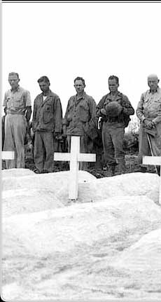 Commanding generals stand before the graves of US troops killed in action. Over 1,600 Americans lost their lives in the battle for Palau. Japanese losses, numbering 11,000 men, were much higher.