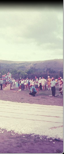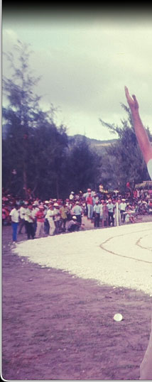 The starter’s hand is raised to signal the beginning of a race at the Micro Olympic Games on Saipan. The Micro Games in 1969 were the earliest of formal inter-island games. They were dropped for a while, but regional games have recently become a yearly event.