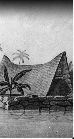 Meanwhile, Rev. Snow and his wife were brought to Kosrae to live in a village like this one sketched by Duperrey 30 years earlier. Like Sturges, Snow found a protector in a chief �the