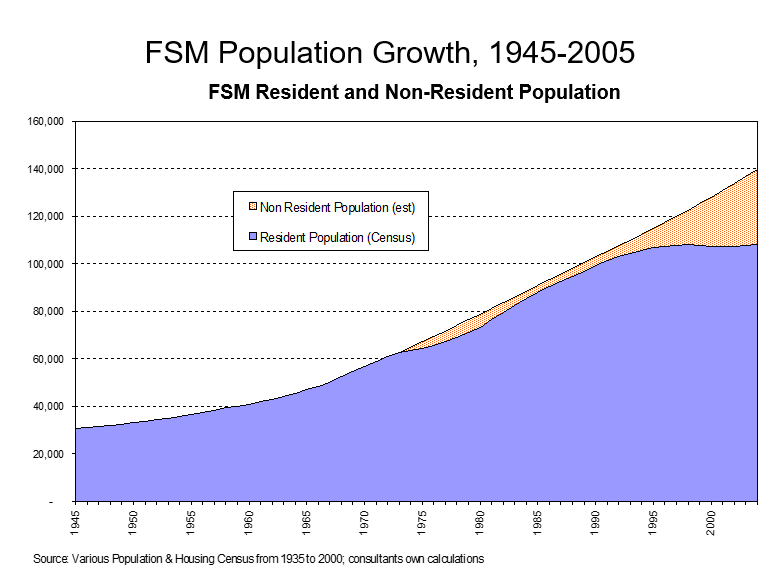 Even these days any number of consultants and other visitors will mention what they regards as the population problem in Micronesia.  When this happens, I explain to them that they’re 15 or 20 years behind times, because we haven’t had what could be called a population problem since the 1980s when the growth rate for FSM was above three percent a year.  The years of rapid population growth, extending from the end of the war through the 1980s, are decidedly over.  The yearly growth rate then was well above 3 percent; between 1994 and 2000 it plummeted to 0.2 percent.