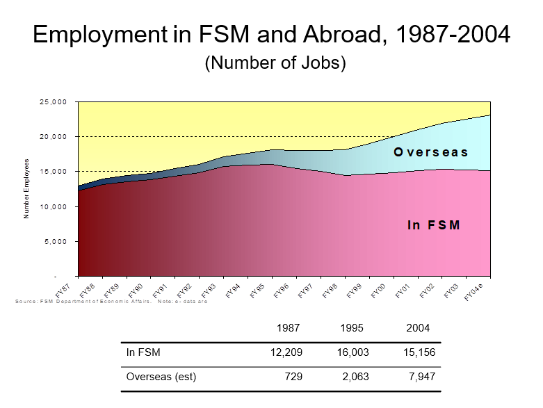 Emigration on the scale we have seen during the last twenty years represents a real resource for the nation, providing we continue to think of those who have left as part of our own community rather than fugitives from FSM.  Other countries in the South Pacific depend heavily on the remittances emigrants send home to support their families, churches or other institutions.  Tonga derives 45 percent of its total income (GDP) from this source, while Samoa obtains 25 percent from remittances.  If each of the 8,000 FSM citizens working abroad were to sent back $1,500 to family and friends in the island, the sum of remittances would total $12 million, or about the same amount that the nation is now obtaining each year from fishing license fees.