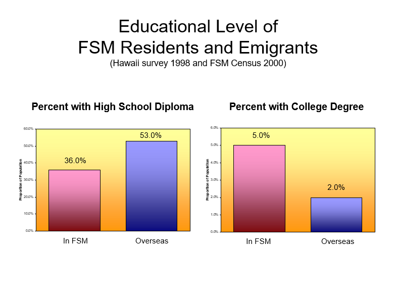 A corollary of these emigration trends relates to the type of vocational education that is truly need today to assure young Micronesians jobs in the future.  Since most of the people we are training will find jobs abroad–ten jobs abroad for every one in FSM–the best “vocational education” will be one that prepares these young people with the survival skills they will need anywhere.  In other words, a basic academic education that stresses functional literacy and numeracy.