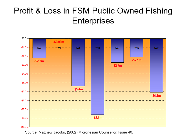 Naturally, FSM aggressively pursued this vision with its Compact development funds during the 1990s.  No fewer than 11 government-financed fishing ventures were established at a total funding of $56 million.  During a seven-year span, as Graph #4 shows, the fishing ventures made a net profit only in a single year (1994) and the profit was no more than $20,000.  Overall, the ventures showed a total loss of over $27 million during that same span.  Hence, FSM investment in the fishing industry and payment of the debt incurred ate up over $80 million during the last decade.