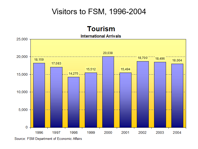 Tourism has long been billed as the second big hope of the FSM economy.  This is entirely understandable in view of the islands’ exotic environment, natural and social, and the appeal that the tropical Pacific has for the imagination of virtually all citizens of the planet.  Moreover, several neighboring islands have struck it big with tourism.  Palau, a relative newcomer to the tourist market, has nearly 100,000 visitors a year; the Northern Marianas have 500,000, and Guam has about 1.2 million.  If these places, so close and seemingly so similar to FSM, can do it, surely FSM can cash in on the apparent tourist boom.