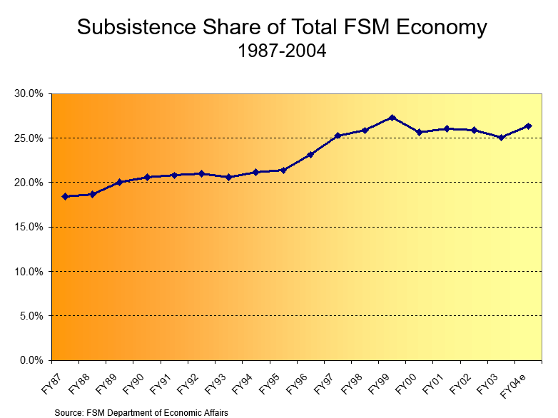 Perhaps our first mistake was in thinking of agriculture as primarily commercial.  We had ignored the importance of subsistence agriculture and household production, activities in which an estimated 45 percent of the FSM population engage.  Even in the towns a surprisingly large number of people depend on locally grown foods as a major part of their diet.  Local food is also shared between members of the family and community, with these exchanges playing a critical  role in strengthening social bonds and cultural ties.  The monetary value of local production is estimated at about $50 million a year, or one-fourth of the total value of the FSM economy.  As Graph #6 indicates, the value of local agriculture increased, from 18 percent to 26 percent, over the period of Compact 1.  This growing share in the total economy, which was due as much to the reduction of US Compact aid as to growth in subsistence agriculture production, clearly depicts the importance of local production as a fallback when external funding is cut back.