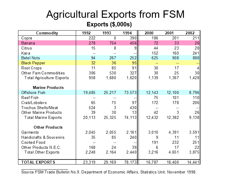 When we turn to commercial agriculture, we find that there is no single dominant export, such as sugar in Fiji, squash in Tonga, or pineapples on Hawaii.  For one thing, large tracts of suitable agricultural land are not available on most of the islands.  For another, small-scale production of cash crops fits better into the rhythm of island social life than extensive plantations requiring full-time employment.  There are commercial exports, as Table 1 shows, but these are generally niche agricultural industries that pop up when occasion offers and which wax or wane according to market conditions and the cost of production and delivery.  For a time in the early 1990s, for instance, bananas became a sizeable export but dropped off sharply in recent years.  Pohnpei pepper, too, was an important product some years ago, serving as a high-quality specialized product that was carefully marketed into a specialized niche.  The regrettable demise of the pepper industry may have been accelerated by some rash government actions, but the emergence of a strong sakau market undoubtedly also played a part in the decline.  As these earlier products have fallen off, others have replaced them.  Sakau exports totaled almost one-quarter million dollars a year in 2002, while the export of betel nuts has climbed to close to a million dollars.  Export of cooked food, which now brings in more money than copra, is another example of opportunistic response to new conditions.  Chuukese pounded breadfruit (kkon) and Pohnpeian banana pudding (pihlohlo), among other island foods, are being distributed and marketed to the growing FSM emigrant population overseas.