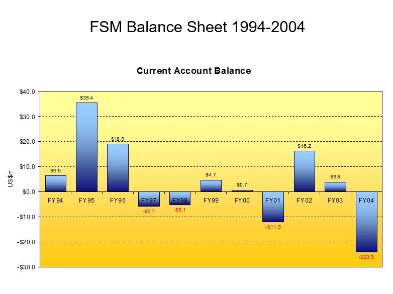 Over the past 11 years, FSM’s exports have amounted to no more than a small fraction of its imports.  Graph 7 shows that imports over this period have averaged about $100 million annually, while total exports amount to barely $20 million a year.  The imbalance of exports and imports in the islands is an old story, a constant reminder of the long distance to go before this imbalance is redressed and the islands are domestically self-reliant.  Yet, when we look at the current account balance for those same years, we find that more often than not there was a positive balance.  Between 1994 and 1996, for instance, Graph 8 indicates that there was positive balance for each of those years even though FSM’s exports were dwarfed by its imports.  In other words, the national income exceeded national expenditure during this time.  Clearly, only part of this income is derived from exports.  The rest comes from financial transfers that include funds received through the Compact, foreign aid from other governments, revenue from fishing license fees, and possibly even remittances.
