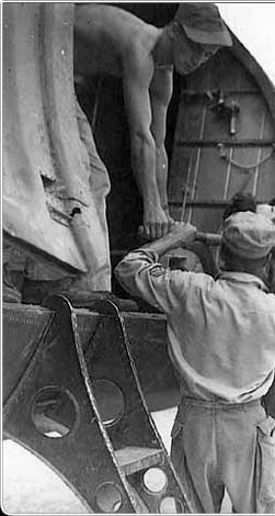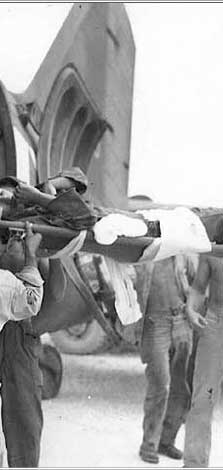 Medics remove soldiers, wounded in the Philippines, from a military transport. By December 1944, Peleliu had a 440 bed hospital at which wounded soldiers stayed for a night or two before continuing their trip back to the US.