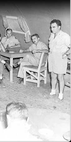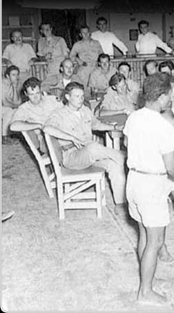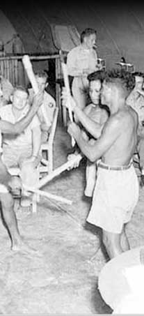 As more Palauans made their way to Peleliu from other parts of Palau, they were put to work for the troops. Here four Palauan young men perform a stick dance as the American soldiers look on.