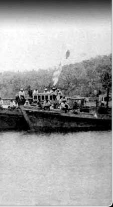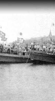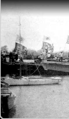 This photo shows a few of the large fleet of fishing boats at dock off Toloas in the early 1930s. The pennants on the boats signal the size of their catch. By 1936, 1500 Okinawans living in Chuuk were catching and processing fish for katsuobushi.
