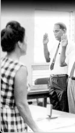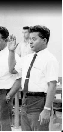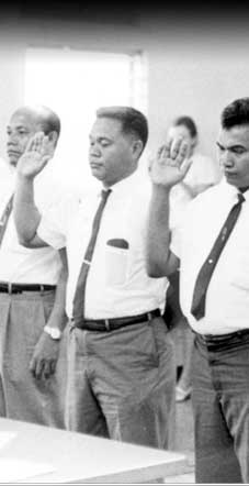 The Congress of Micronesia met for its first session in July 1965 on Saipan. Here new members of Congress are being sworn in: Andon Amaraich, David Ramarui, Francisco Palacios, Petrus Tun, and Hiroshi Ishmael.