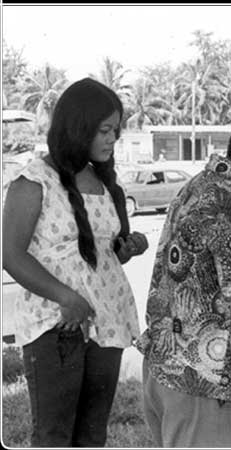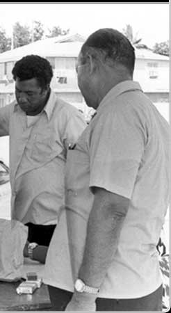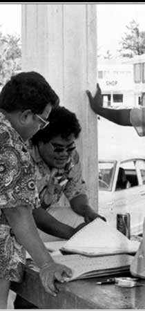 These voters in Garapan are casting their ballots on the Covenant at the June 1975 plebiscite. When the votes were tallied, over 75% favored the new commonwealth status.