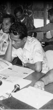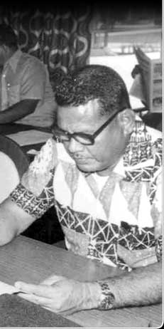 Despite the threatened boycotts and long impasses over the summer, the convention had its easier moments. Here Soiter Mwety from Chuuk relaxes at his table with Gideon Doone and Chiro Albert.