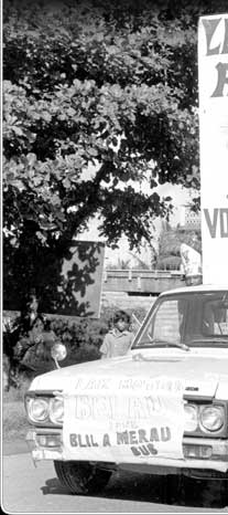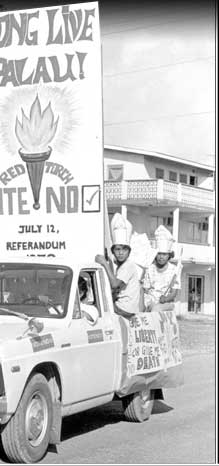 Not all Palauans supported Palau's membership in the FSM, as the sign on this vehicle shows. By 1978, when the referendum on the FSM constitution was held, Palauan separatist leanings had greatly expanded.