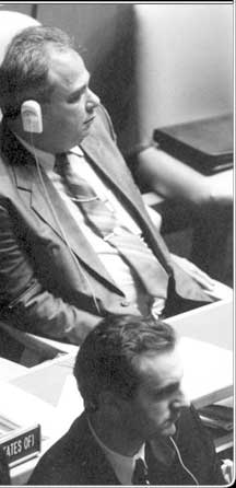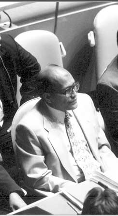 The new nations were soon back at the UN-this time not as suppliants before the Trusteeship Council, but as full memebers of the General Assembly. This FSM delegation in 1996 included Asterio Takesy, Resio Moses, Redley Killion, and Jim Lippwe.