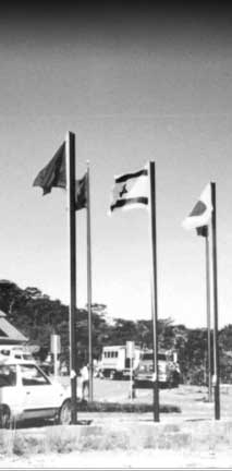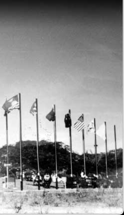 Above the new FSM national capital at Palikir, completed in the mid-1900s, flew the flags of many countries. At the left is the FSM flag, similar in design to the old Trust Territory flag but with a couple of stars missing.