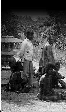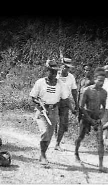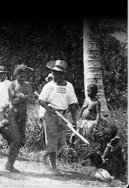 In administering justice, German officials sometimes dealt harsh punishments. In this photo police guards are escorting two Yapese men who were charged with murder off to the site of their execution. The photo was taken on Saipan in 1907.