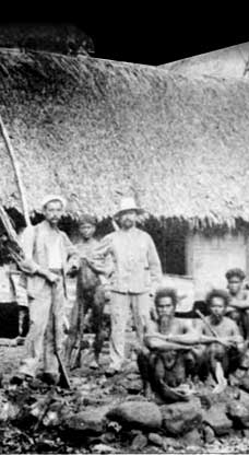 In Palau, life during this time had not changed much from a century earlier. Here a group of Palauan men sit in front of a house next to two European traders. The small building to the left is a spirit house, used when people wished to communicate with the dead. By the end of German rule in 1914, Palau had begun its rapid march to modernization.