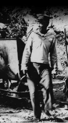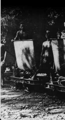 In 1909, Germans began to mine phosphate on Angaur, Palau. The laborers shown here were recruited from Yap and Palau to work on one-year contracts. They made the equivalent of four dollars a month. Mining operations continued on Angaur for more than thirty years.