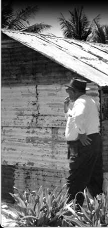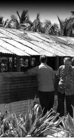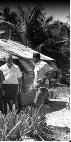 Attempts at reform were to begin with education. Here Goding and a party of US congressmen inspect a rickety old classroom building on Falalap, Ulithi.