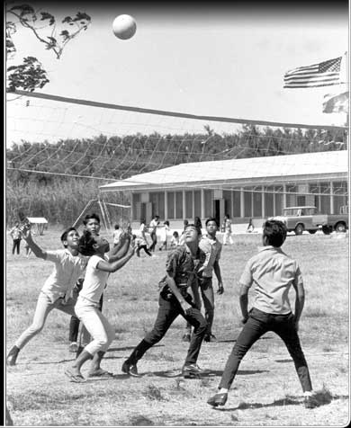 New high schools also were built. Students at Tinian High School play volleyball in front of their new school. Just a few years before they would have had to go to Saipan or further to attend high school.