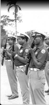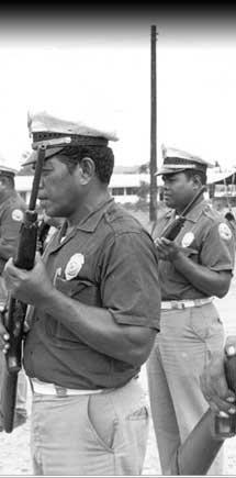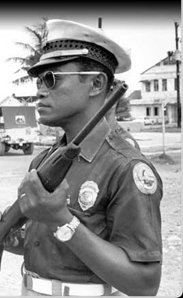 The local police forces, which could be traced all the way back to German times, were better equipped than ever. The Palau police force here presents arms at a drill.