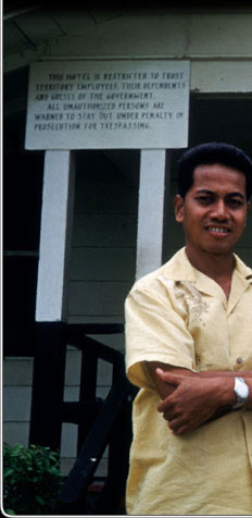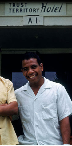 These two Micronesians stand in front of the Micronesian Hotel on Guam. During the 1950s this was the place where everyone stayed–if only because there was nowhere else to go. Visitors to the Trust Territory were housed there during the long wait for a seat on a flight to the islands.