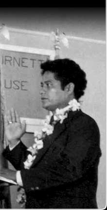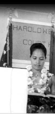 Jacob Nena, standing next to his wife Lerina, takes the oath of office as the first Micronesian District Administrator of Kosrae in 1977. For years Kosrae had been part of Pohnpei District. It was only in 1977 that it emerged out the shadows to become a district of its own.