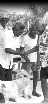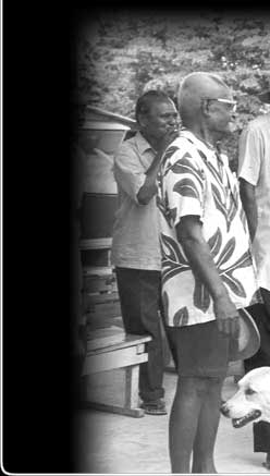 As Micronesians were being promoted to high-level government positions, traditional leaders were not entirely neglected. These leaders were meeting at regular conferences. Here the Palau chiefs greet one another before one of their meetings in the early 1970s.