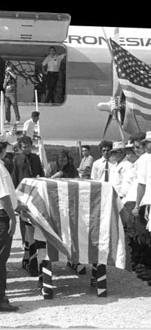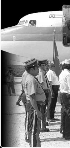 When a prominent traditional leader died, he was honored with a state funeral. Here the police line up at the Palau airport to escort the body of Ibedul Ngoriakl in September 1972. The body was brought in procession to the Palau Legislature, where it was waked.