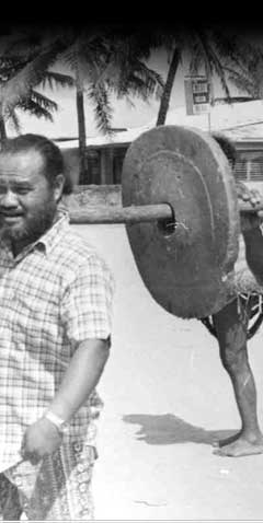 The march towards full self-government in the islands went on. At times, traditional leaders and the new government elite marched step-for-step in the same direction. Here Andrew Roboman, one of the ranking chiefs of Yap, and John Mangefel, then a Yap congressman, carry a piece of stone money to the opening of Yap's first bank in 1976.