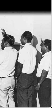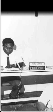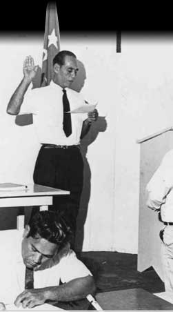 Throughout these years, a new crop of leaders was surfacing everywhere. Here Karl Kohler, Chief Justice of the Pohnpei District Court, administers the oath of office to three new legislators: Atiner Tihpen, Tobias Soulik, and Alter Paul.