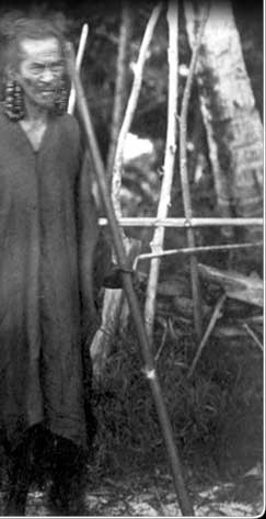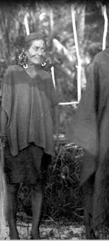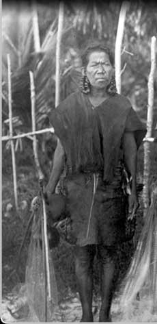 Takurar, the ranking chief on Weno, leads his two wives along the path. He and the two women are wearing ear ornaments and ponchos, clothing distinctive of Chuuk. The women are carrying fishing nets.