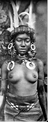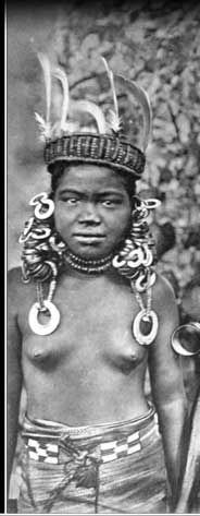 These two girls from Lukunor in the Mortlocks are dressed to dance. They wear the headdress with feathers, especially decorative (and heavy) ear ornaments, and colored shell waistbands.