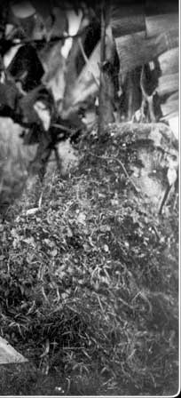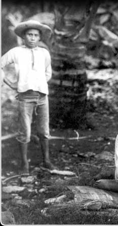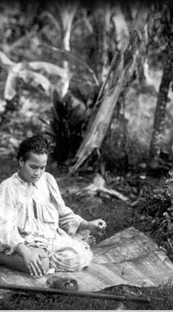 Kosraeans too wore western clothes, thanks to the missionary influence of half a century. Here a young man in a sombrero watches a woman prepare banana fiber for weaving. This photo was taken at Fengal Village in 1899.