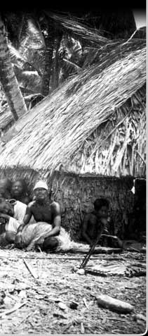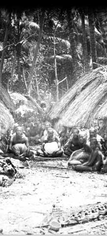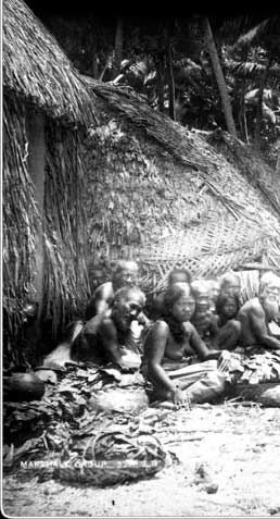 This Marshallese village scene was shot in the 1880s, but we don't know where. The houses are built in the old Marshallese style and the people are wearing traditional clothing.