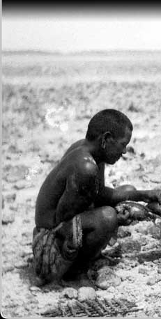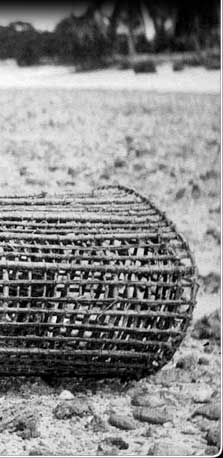 Here a Marshallese man examines the fish he has caught in his wicker fish trap. Fish traps of this sort were used on many islands throughout the region.