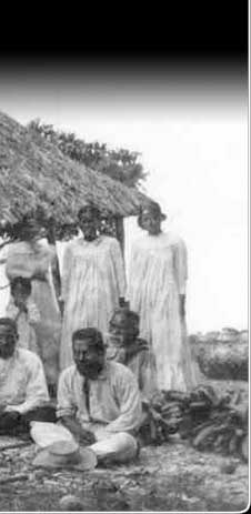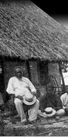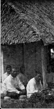 Kabua, the most important chief in the Marshalls, is seated outside his house on Ebon in this 1890 photo. His house is raised off the ground and the sides made of slats rather than thatch. Western clothing was common among more wealthy Marshallese.