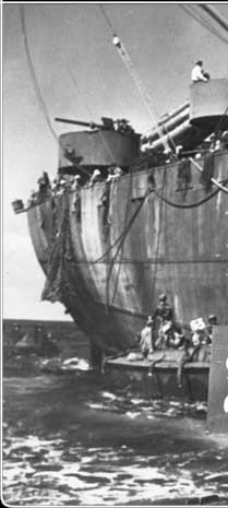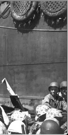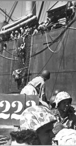 US troops here climb down the nets and board the landing craft that will take them to the shore. The ground assault on Roi-Namur in the north began on January 31, while the attack on Kwajalein began the next day.