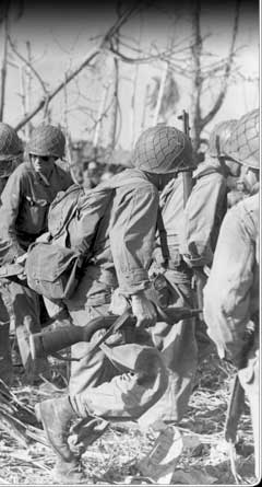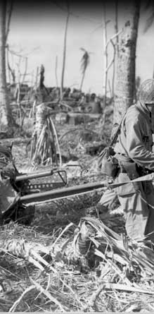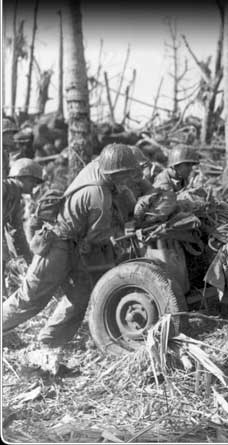 Troops here move a gun up to the front as they advance up Kwajalein. Japanese defenders fired from cement bunkers and blockhouses.