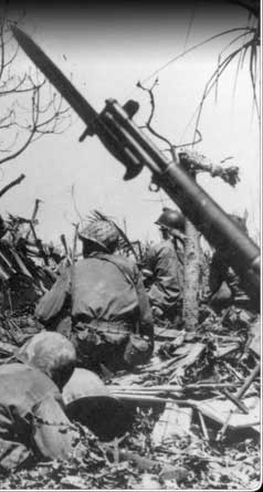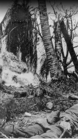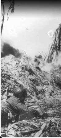 The military sweep of the island sometimes met heavy resistance from Japanese defenders. Here US soldiers are pinned down by Japanese snipers.