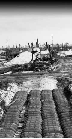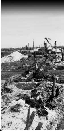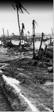 After three days of bombardment and five days of battle, Kwajalein was a wasteland. Japanese-built fortifications and trees alike were leveled, as this photo shows. The bomb pit in the foreground is to supply the US planes that would fly out of Kwajalein on bombing missions in the months ahead.