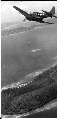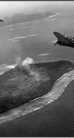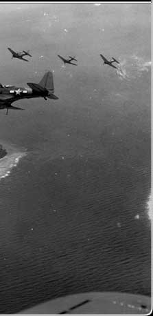 US Dauntless dive bombers fly in formation over Siis Island in Chuuk. While US planes from Tarawa made bombing raids on Pohnpei, the carrier-based planes of Task Force 58 struck Chuuk in mid-February 1944.