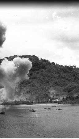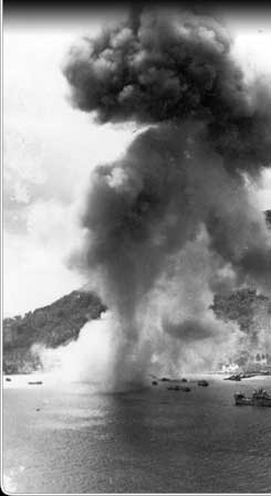 Bombs explode on Toloas and torpedoes destroy ships anchored offshore. Almost all of the ships sunk during the two-day bombing raid were Japanese tankers and freighters. The naval ships had departed for Palau before the attack.