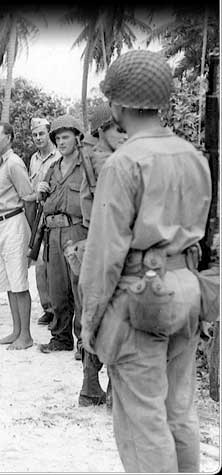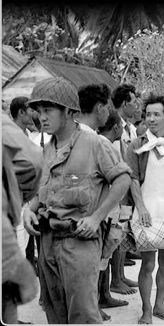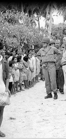 Other atolls in the Marshalls fell to the US during the next few months. These people from Arno are gathered to hear a US military proclamation laying down the regulations for the island.