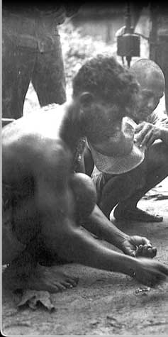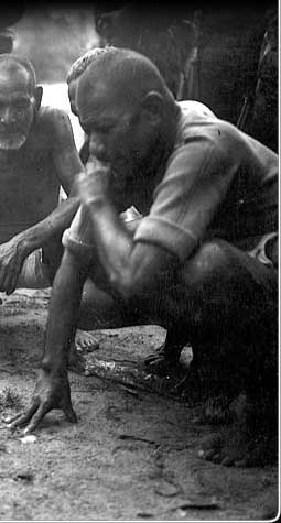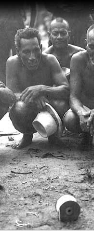 Majuro was taken by US military without any resistance, since Japanese troops had abandoned it a year earlier. This circle of men are dividing up the fishhooks and small gifts given them by US soldiers.
