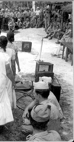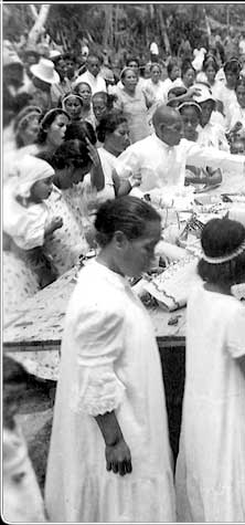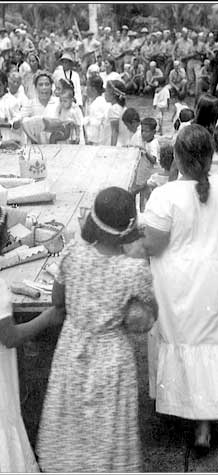 By July 4 the people of Majuro were ready to celebrate once again. Here women parade around a table, leaving handicraft and other gifts for the GIs. The atoll population staged a big celebration for the US military on Independence Day.