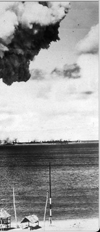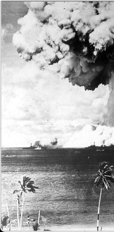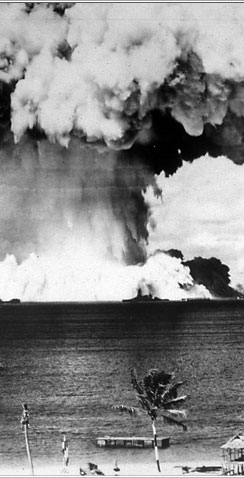 The first nuclear bomb was exploded on Bikini in July 1946, four months after the evacuation. Two tests were made, the first above ground and the second underwater.