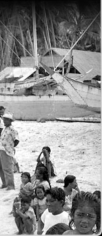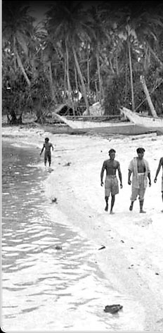 Meanwhile, the 142 people of Enewetak were resettled on Ujelang in December 1947 so that their atoll could be used as a second testing site. The Enewetak people, scattered on the beach here, had traditional ties with Ujelang.