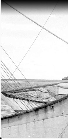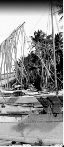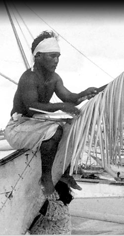 Even in this atomic age, life continued as it was in these islands. Atoms might be split elsewhere, but here Lombwe affixes a charm to the prow of his canoe to protect himself before sailing to Bird Island.